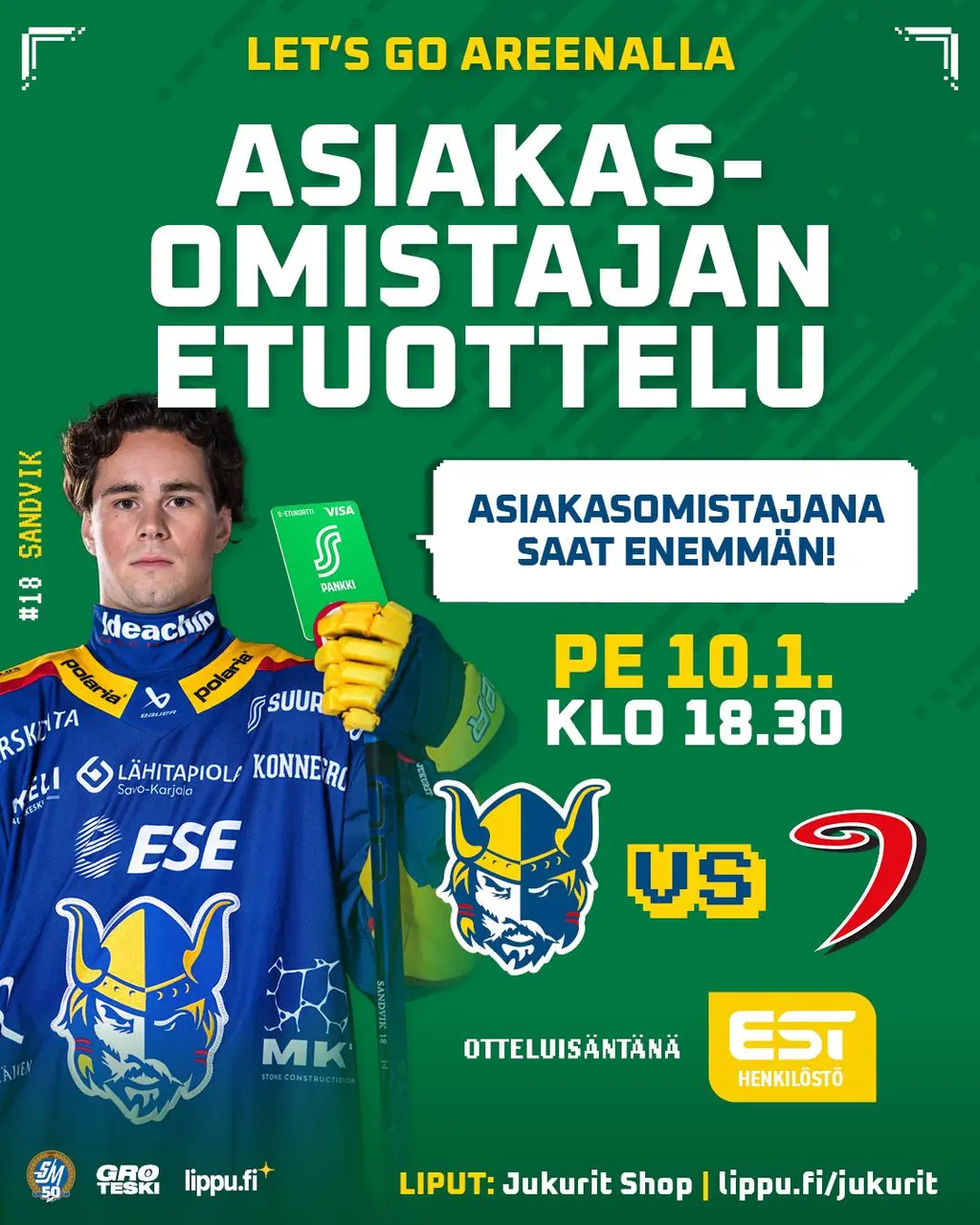 Asiakasomistajien Tilipäivän kunniaksi perjantaina 10.1.2025 pelattava Jukurit-Jyp -ottelu on Osuuskauppa Suur-Savon asiakasomistajien etuottelu!Asiakasomistajilla on mahdollisuus hankkia otteluun etuhintaiset liput S-mobiilista.Asiakasomistajien lippuja on myytävänä seisoma- sekä istumapaikoille (7/13,50€) rajoitettu määrä.Kurkkaa etu S-mobiilista, tai osta lippusi suoraan lippu.fi