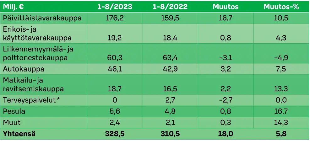 Osuuskauppa Suur-Savo -konsernin liikevaihto tammi-elokuussa oli 328,5 milj. euroa. Kasvua edelliseen vuoteen oli 18,0 milj. euroa (5,8 %). Liikevaihdon kehitys on ollut hyvä kautta linjan – erityisesti marketkaupassa sekä matkailu- ja ravitsemiskaupassa. Isot Mikkelin Prismaan liittyvät päätökset tehdään loka-marraskuun aikana.Liikevaihto kasvu-uralla alkuvuonna lähes kaikilla toimialoilla