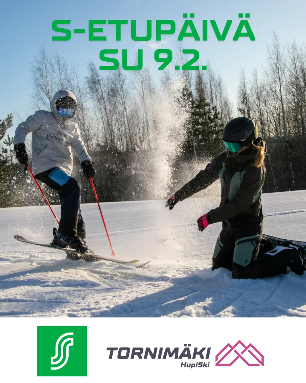 Hupia ja rinneiloja!Tornimäen laskettelukeskus tarjoaa Osuuskauppa Suur-Savon asiakasomistajilleSUNNUNTAINA 9.2.2025S-Etukortilla 5 euron alennuksen3 h hissilipusta ja 3 h välinevuokrasta! Edun lisäksi ei Bonusta.Tornimäki on hyvän tuulen ja täyden palvelun laskettelukeskus vain 10 minuutin matkan päässä Mikkelin torilta. Huippukuntoiset rinteet ja street, ilmainen lastenmaa pulkkamäkineen sekä TorniCafen suussa sulavat herkut tarjoavat loistavat puitteet iloisen ulkoilupäivän viettoon!Tornimäelle kurvaavat myös Apsi ja Onni, joten kurvaathan Sinäkin! Lue lisää Tornimäen palvelutarjonnasta www.tornimaki.fi