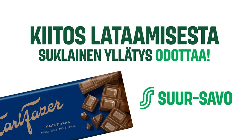 Lataa asiakasomistajan oma S-mobiili-sovellus käyttöösi vuoden 2025 aikana, niin Osuuskauppa Suur-Savon asiakasomistajana saat uuden lataajan* etuna Fazerin suklaalevyn (maitosuklaa, maku- tai tummasuklaa 180–200 g) veloituksetta Osuuskauppa Suur-Savon Prismoista, S-marketeista, Saleista sekä ABC Marketeista.